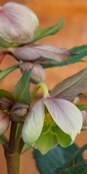 Well named for its very attractive evergreen foliage, leathery silver-grey serrated leaves with pale green veining and flushed red undersides, the flowers that emerge in midwinter are equally striking. Held in small clusters above the architectural leaves, its simple elegant cup-like flowers are palest green with dusky pink reverse.